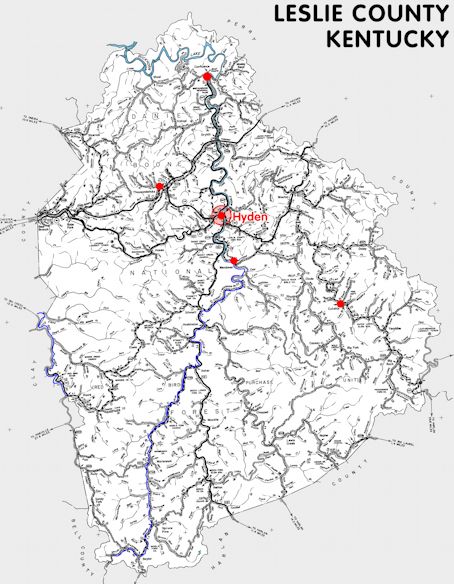 Leslie county is in the Eastern Coal Field region of Kentucky. The elevation in the county ranges from 757 to 2600 feet above sea level.