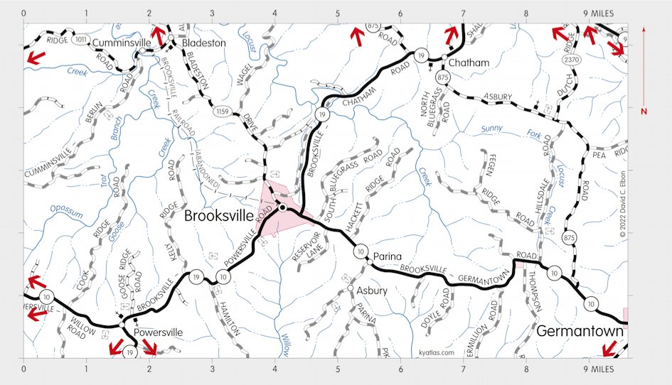 Brooksville, the seat of Bracken county, began as the settlement Woodward's Crossroads in the late 1700s. The county seat was moved from nearby Augusta in 1839 and the town was renamed Brooksville for David Brooks, the legislator who introduced the bill that made the change.